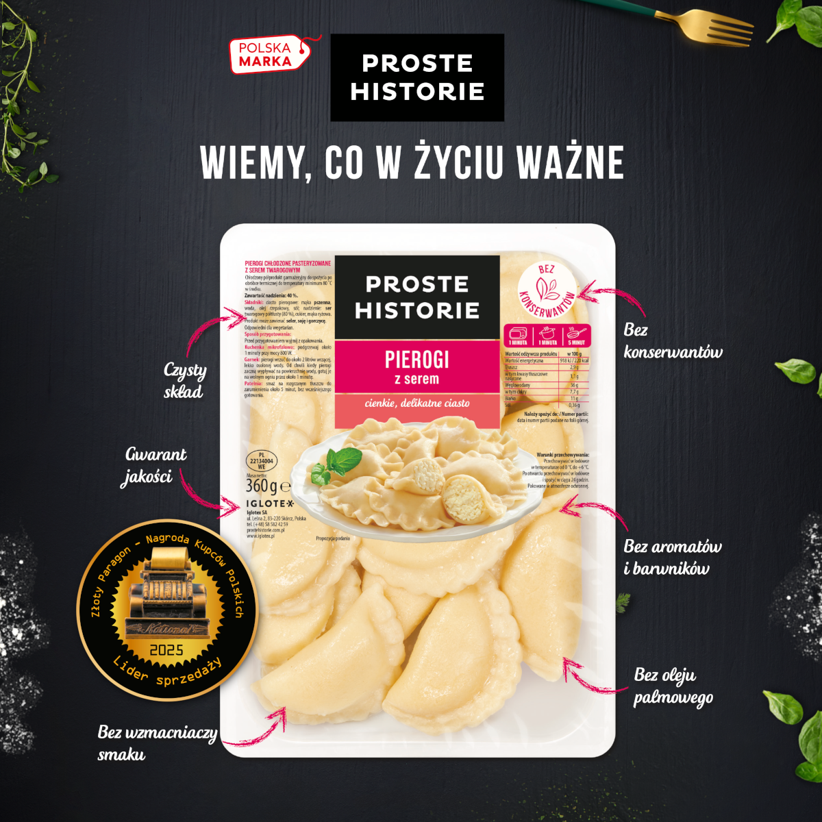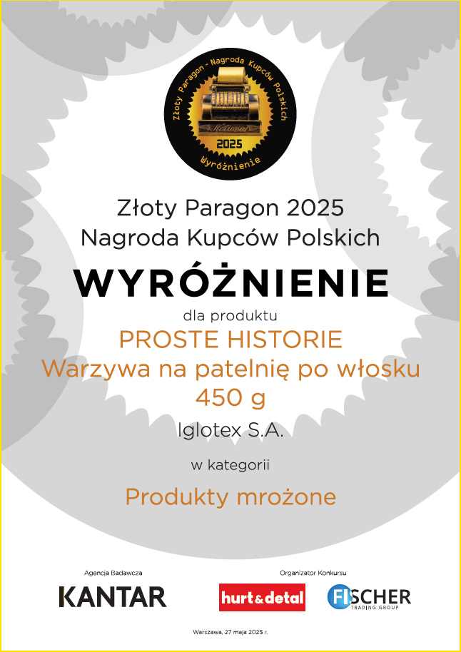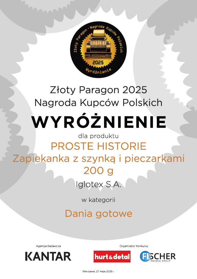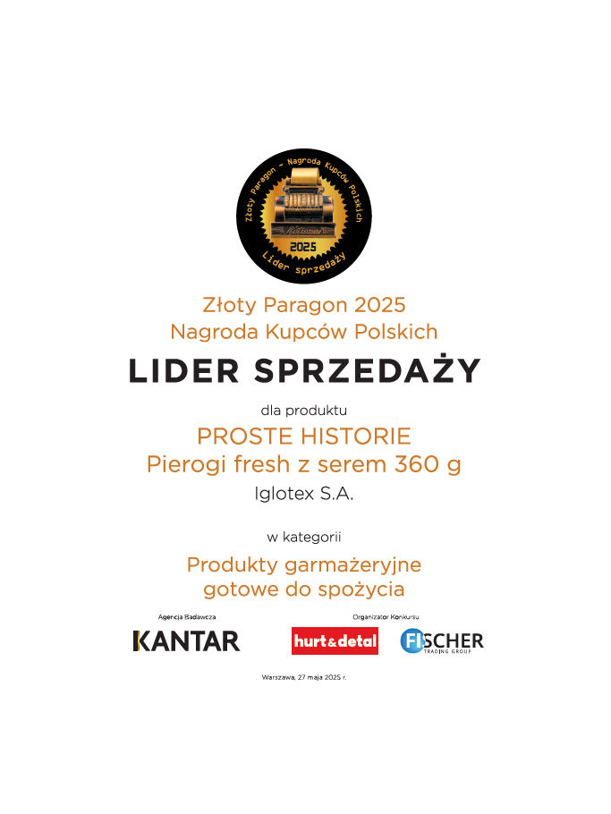 W kategorii Produkty garmażeryjne gotowe do spożycia pierwsze miejsce i statuetkę Złotego Paragonu otrzymały Pierogi fresh z serem 360 g PROSTE HISTORIE. To wyjątkowe wyróżnienie, bo przyznane przez tych, którzy najlepiej znają potrzeby konsumentów – kupców i detalistów.